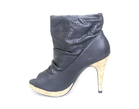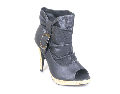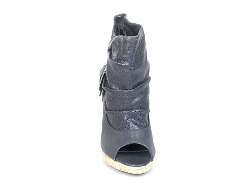 Описание: Дамска лятна бота. Атрактивен модел, с отворени пръсти и стилна катарама, изработен от изкуствена кожа с перфорация. Ходилото е на ефектен корков ток, с височина 11 см.